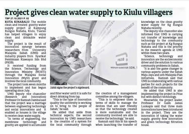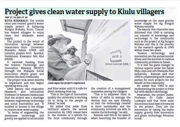 This featured segment from Berita RTM highlights the innovative water supply project managed by Pembinaan Kiawayan Sdn. Bhd., in collaboration with Universiti Malaysia Sabah (UMS) and funded by the Ministry of Science, Technology and Innovation (MOSTI). The report showcases how a gravity-fed system using membrane filtration is transforming lives in Kg. Rungus Nahaba, Tuaran — bringing clean and treated water directly to 30 households without the use of electricity.